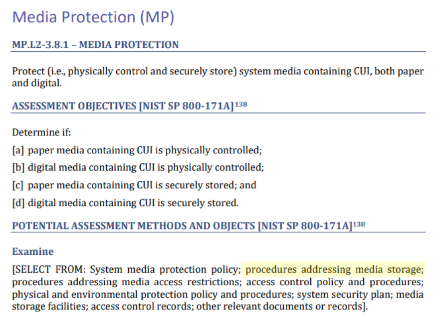 The Media Protection (MP) domain focuses on handling physical and digital storage containers. This includes everything from USB and disk drives to documents and backup tapes. Locking down your network doesn't prevent data exfiltration on a thumb drive. The MP family controls the life-cycle of your media. You must limit who can use removable media. You must label media containing sensitive information.