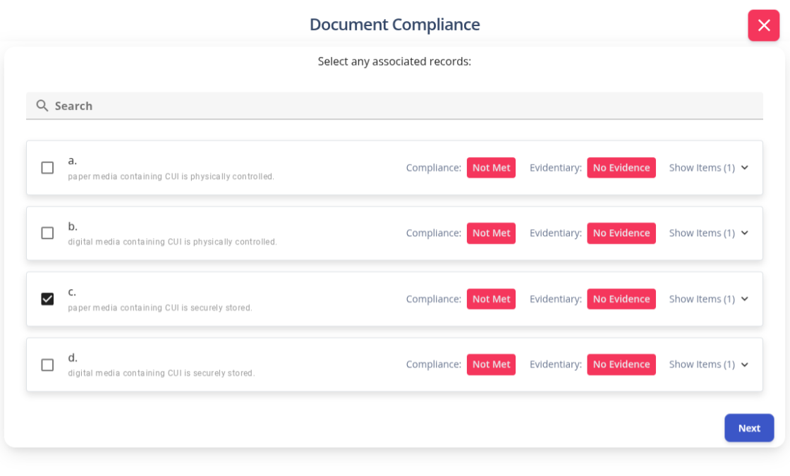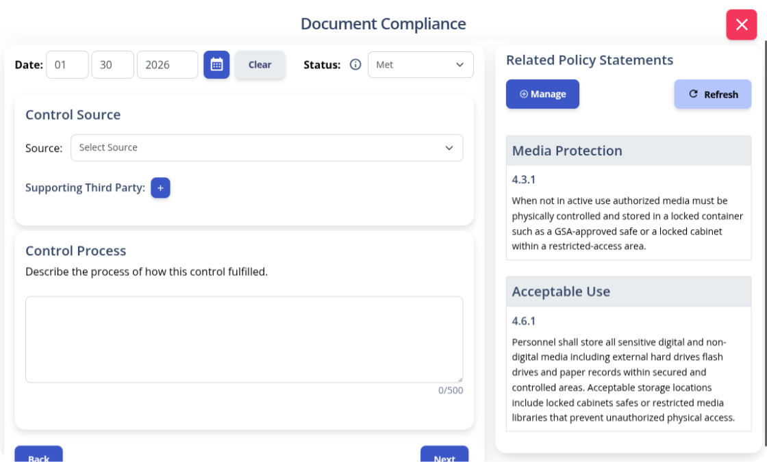 After selecting a criteria, K2 GRC shows policy statements relevant to that criteria. The input screen shows the specific policy name and the statement’s number. This enables users to cite relevant policy sections within the control narratives. The system aggregates these control narratives to populate the system security plan (SSP).